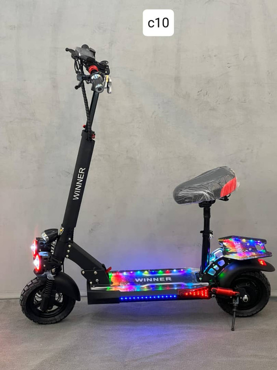 اسکوتر برقی صندلی دار برند وینر تاشو و قابل تنظیم ارتفاع بلوتوث دار دارای ریموت و دزد گیر فول led دارای مچی گاز و صفحه نمایش